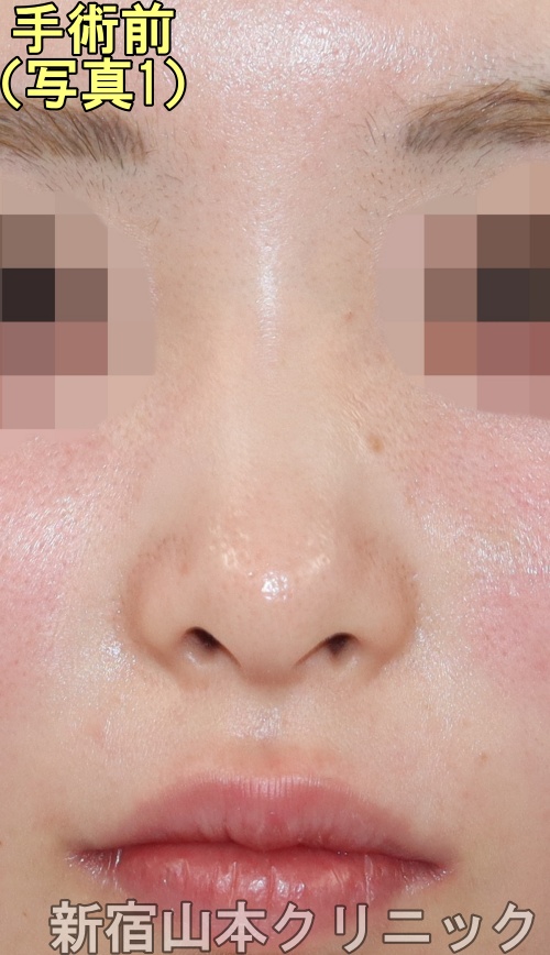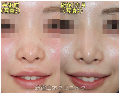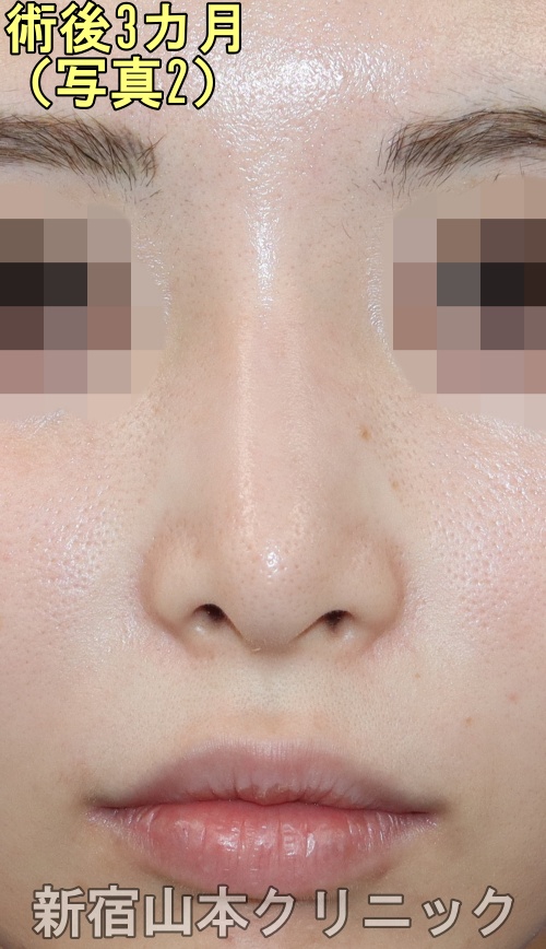 では、術前(写真1)と術後3か月(写真2)の正面の変化をご覧頂きたいと思います。鼻筋が通り、鼻尖が細くなったことで、全体的に大人っぽい印象に変わったのがお分かり頂けるはずです。
