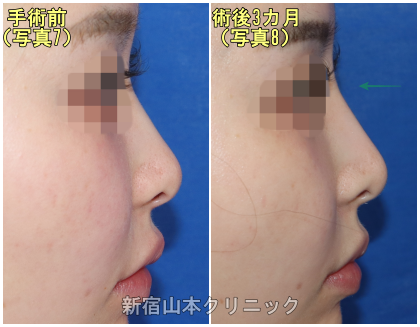 横顔では、術前に比べ、矢印で示したように鼻根部が高くなっていることがプロテーゼ効果です(写真7, 8)。