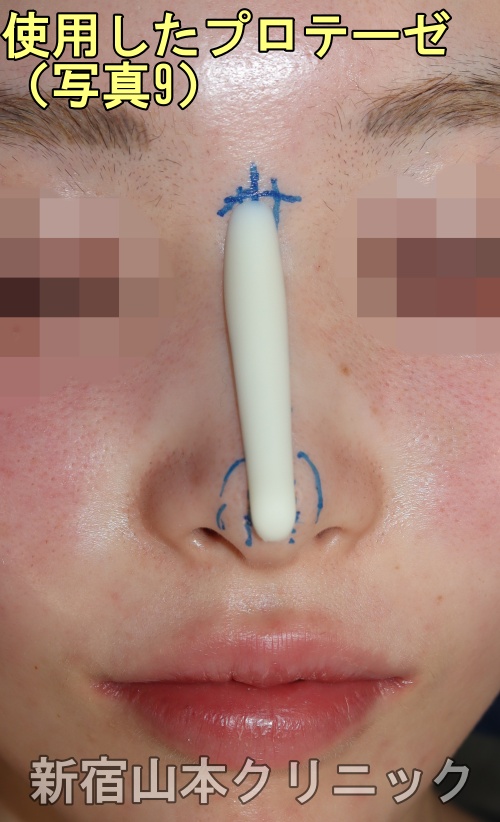 ここで、使用したプロテーゼ(写真9)をお見せしたいと思います。このプロテーゼの長さを間違えてしまうと鼻が長くなった『魔女鼻』や鼻が短くなった『アップノーズ』が仕上がります。これは医者のセンスが大きく影響する部分です。