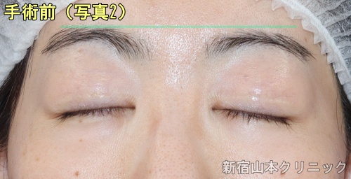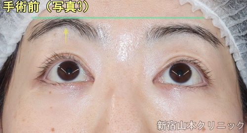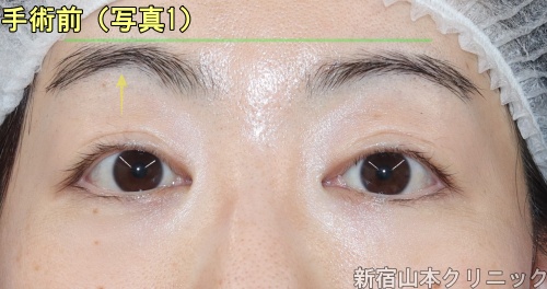 では、術前の状態をご紹介します。開瞼時の状態に緑色の線を書きました。これは左右で眉毛の位置が揃っていないという事を示すためのものです。右眉毛の位置が黄色い矢印で示すように上がっています(写真1)。