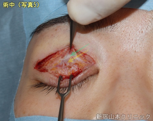 術中所見をお見せします。まず、右目の状態です。緑色の矢印で示した部分が挙筋腱膜で、黄色い矢印で示した部分がミュラー筋です。本来ミュラー筋は見えずに挙筋腱膜の下にいるはずですので、挙筋腱膜が外れてめくれたために下にあるミュラー筋が見えているのです(写真5)。