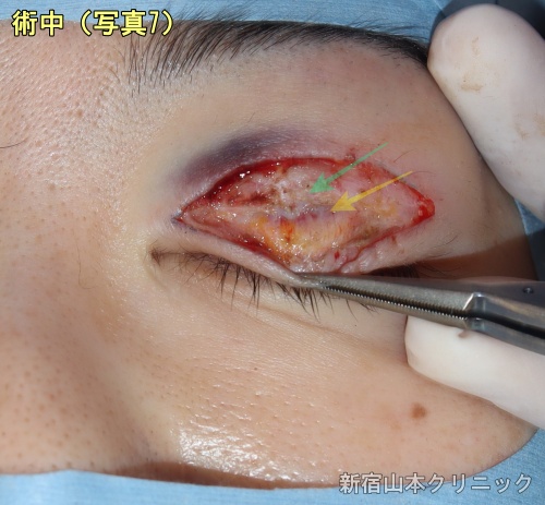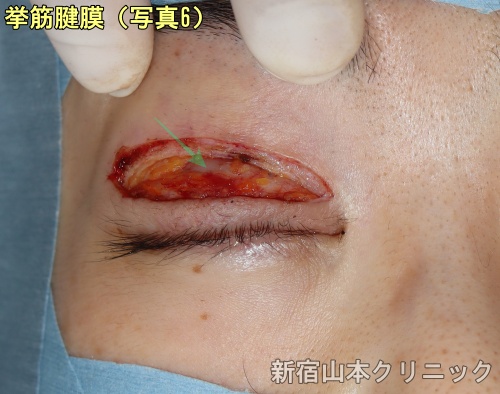 この位置関係を修復すると、ミュラー筋は見えずに緑色の矢印で示した挙筋腱膜だけが見えるようになります(写真6)。