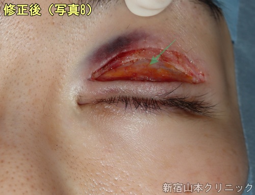 この状態を適切な位置に修復すると、挙筋腱膜(緑色の矢印部分)のみ見えるようになります(写真8)。