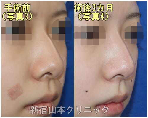 斜めから見ていただくと、術前(写真3)と術後3か月(写真4)では、鼻先の尖り方と高さ、鼻先の変化が出て、鼻骨のボリュームが減ったことにより鼻筋が通ったように見えます。