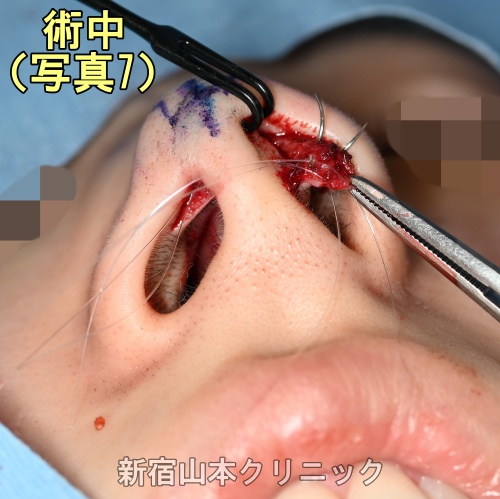 この鼻先の変化は、左右の軟骨を曲げてから寄せるという方法によるものです(写真7)。