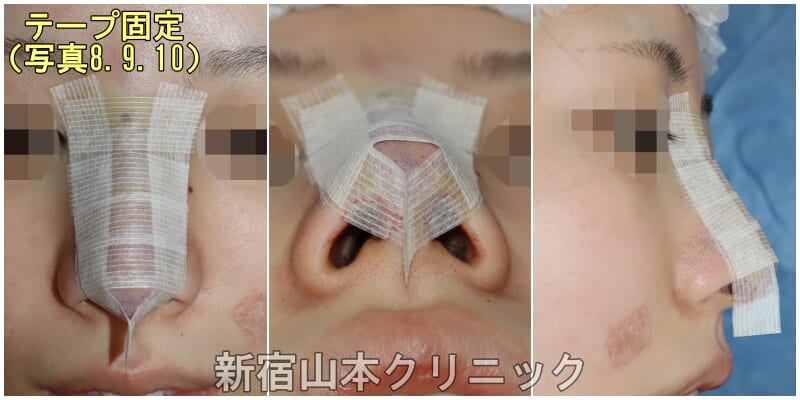 このようなしてこのような手術をすると、鼻の中にガーゼを入れる医療機関も多いようですが、私はテープ固定とギブス固定で十分だと考えています(写真8, 9, 10)。術前計画から術後固定に至るまで、担当医の感性が出ますので、症例写真のみではなく、固定の画像も出しているかをチェックすることが大事だと思います。