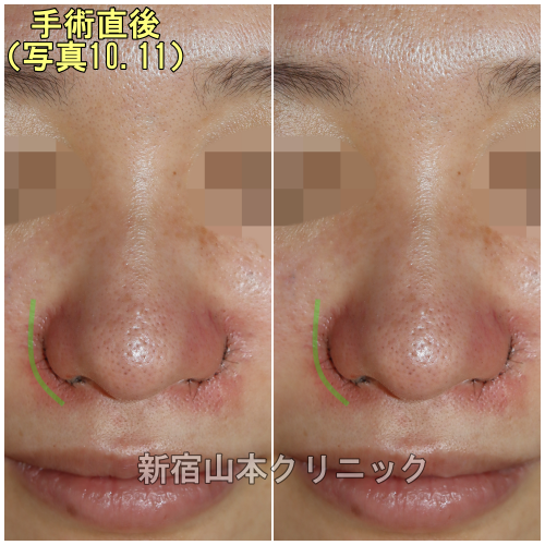 私は、『自然な変化』を得意としているのですが、デザインだけでなく、縫合も曲線的、曲面的に行います。これは、職人芸の一部だと自負しています。メスをざっくりとした切り方で使うと、小鼻の丸みが無くなってしまいます。縫合を終了した状態をお見せしますので、他院と比べて丸みが残った縫合を認識して頂きたいと思います(写真10, 11)。
