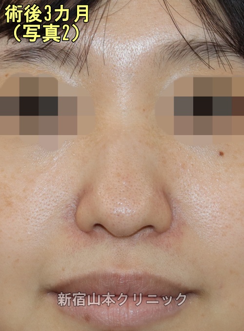 小鼻の張りが抑えられて、全体的な横幅も小さく見える事がお分かり頂けると思います。鼻の存在感が『なんとなく』少なくなったとも言えると思います。小鼻だけの手術でも不自然になっていないこともお分かり頂けるはずです。