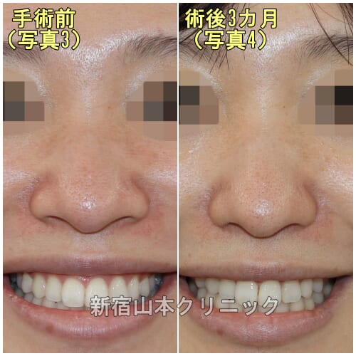 笑った状態でも、術前(写真3)と術後3か月(写真4)では、小鼻の横幅と広がり方が変わり、鼻の穴の見え方が変わったこともお分かり頂けると思います。この時に小鼻の横に不自然な線が出ていないことが大事です。