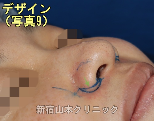 手術デザインでは、矢印で示したように、左小鼻の丸みが損なわれない曲線的なデザインを使用します(写真9)。