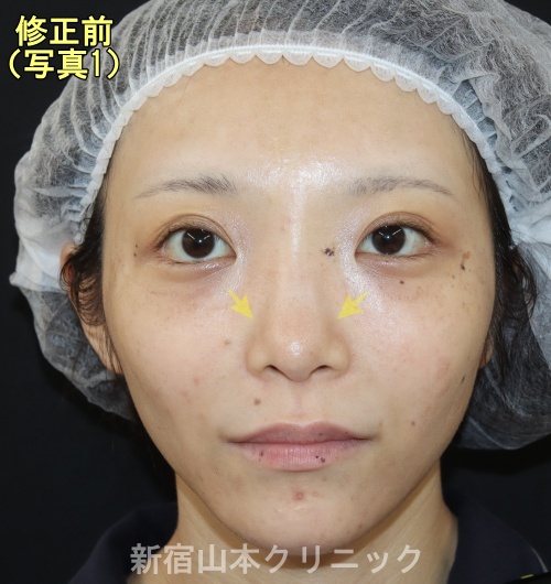 今回ご紹介するのは、鼻尖部に他院で軟骨移植を受けられた方の修正手術です。ご本人は鼻尖の形状はよくなったけれども、その上の部分(写真1矢印)が気になるという事でした。